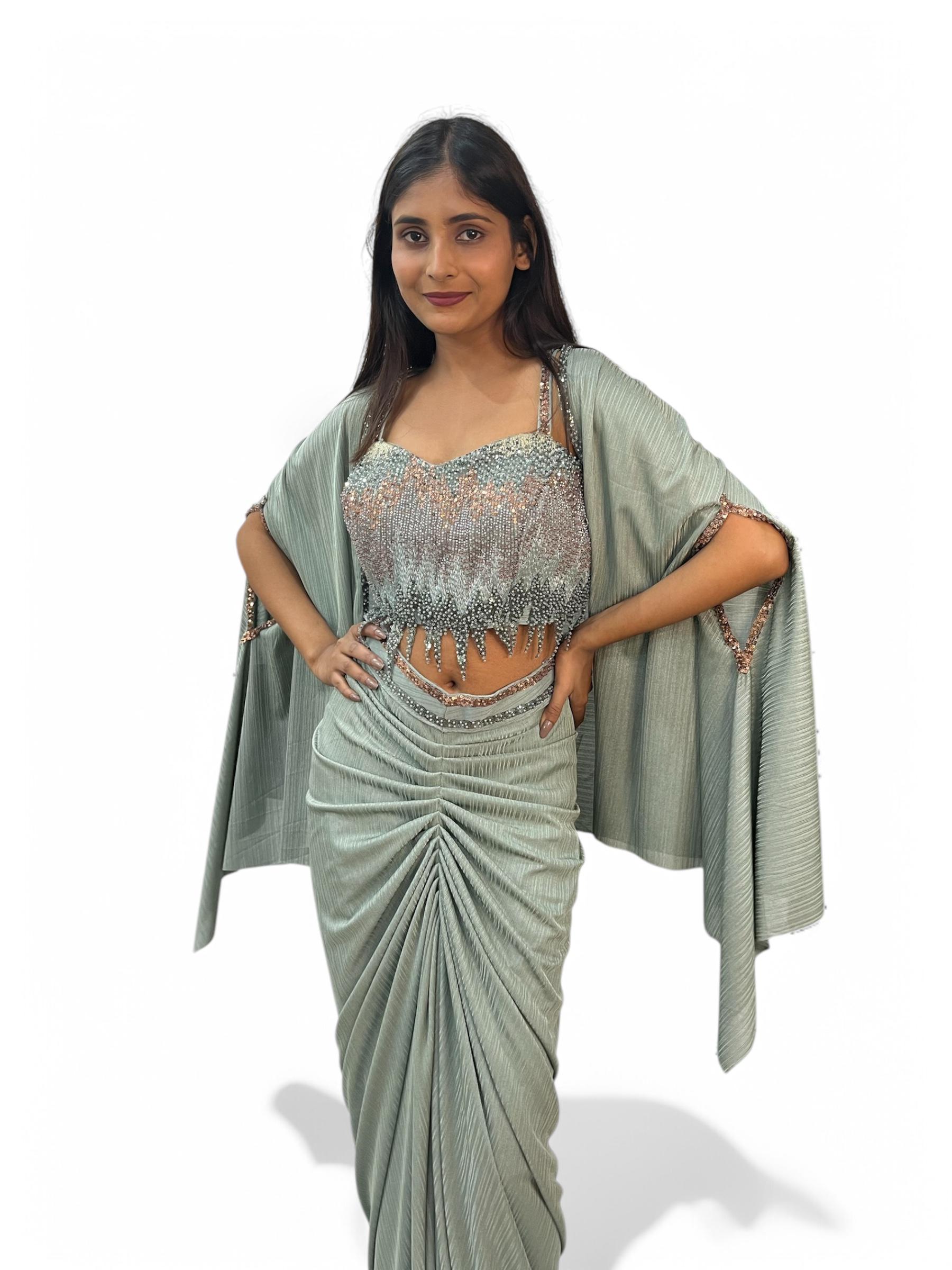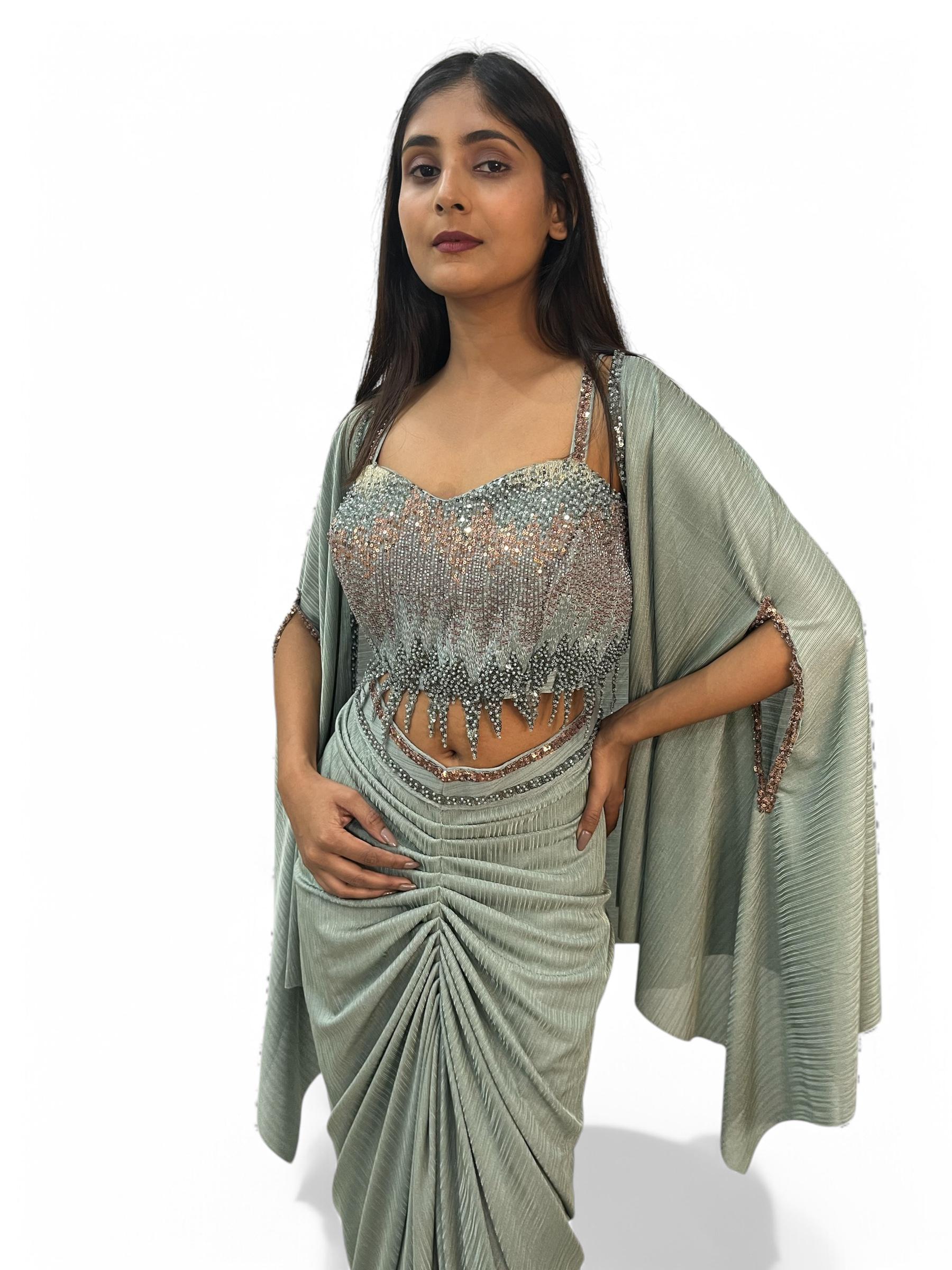 Enhance your wardrobe with this 3-piece set with a draped skirt, featuring a chic top, a stylish shrug, and a flowy draped skirt with elegant asymmetrical or gathered detailing. Perfect for weddings, festive occasions, and evening wear, this ensemble offers a sophisticated yet modern look.