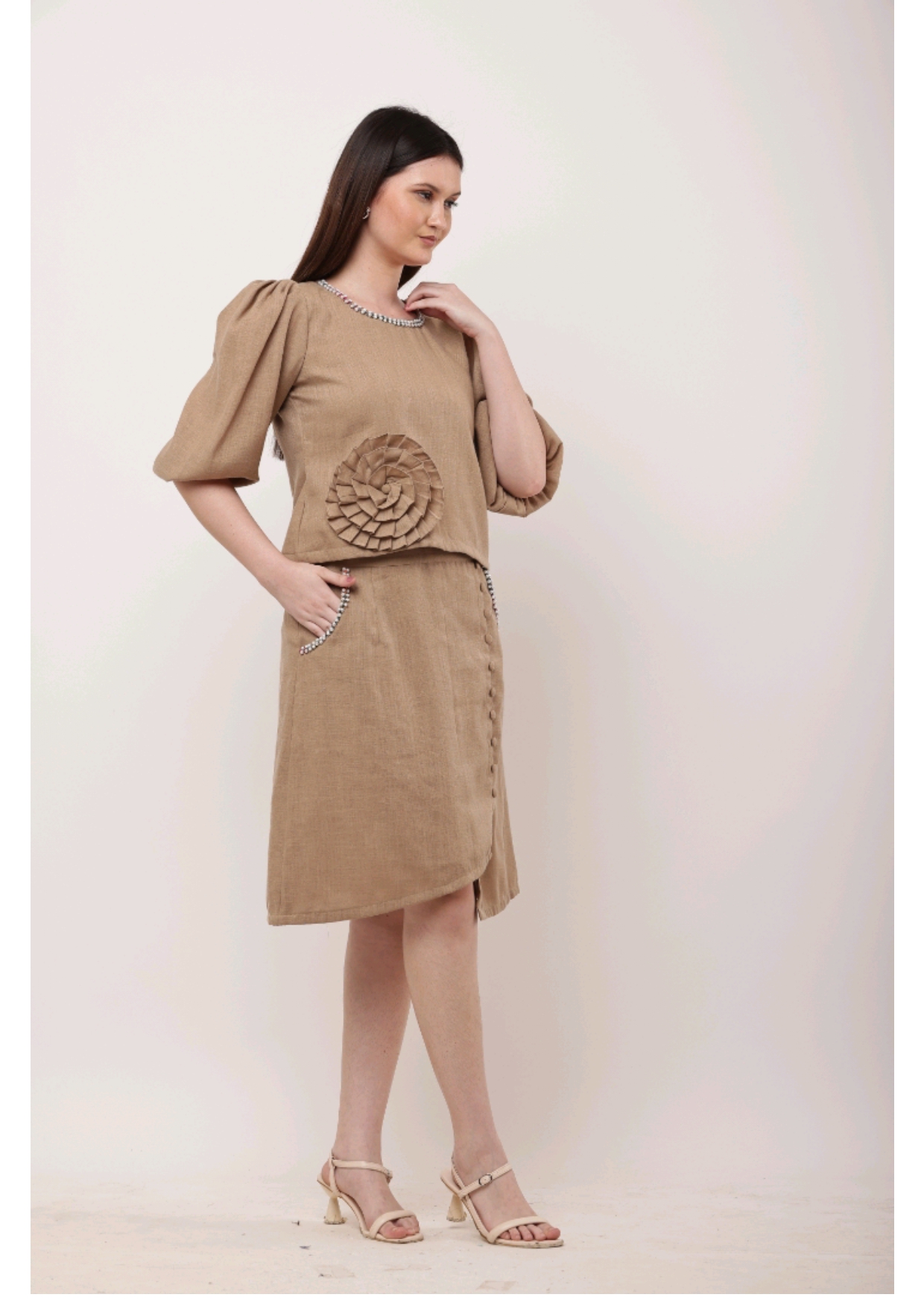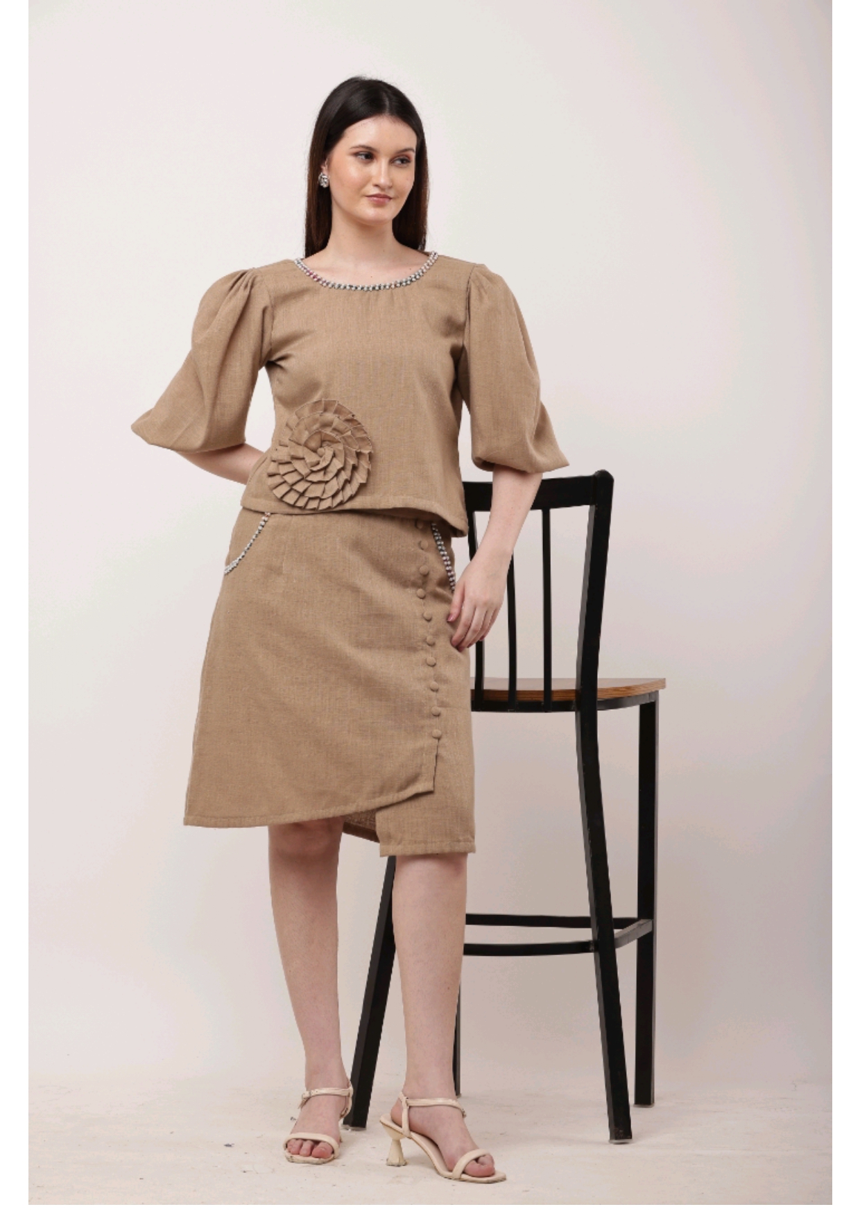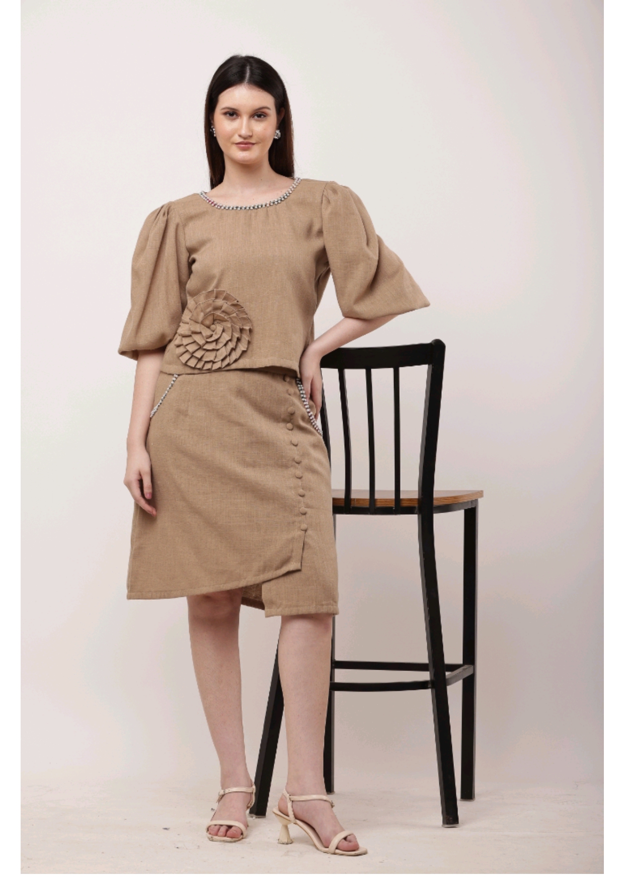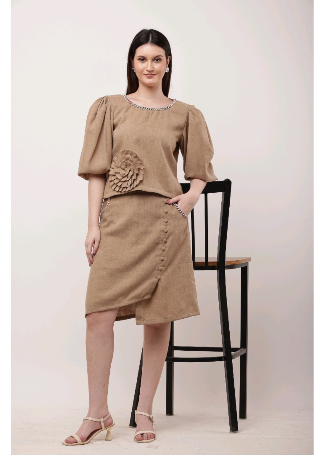 A blend of subtle charm and artistic detail – this camel-toned co-ord set with statement embroidery is perfect for chic, understated style.