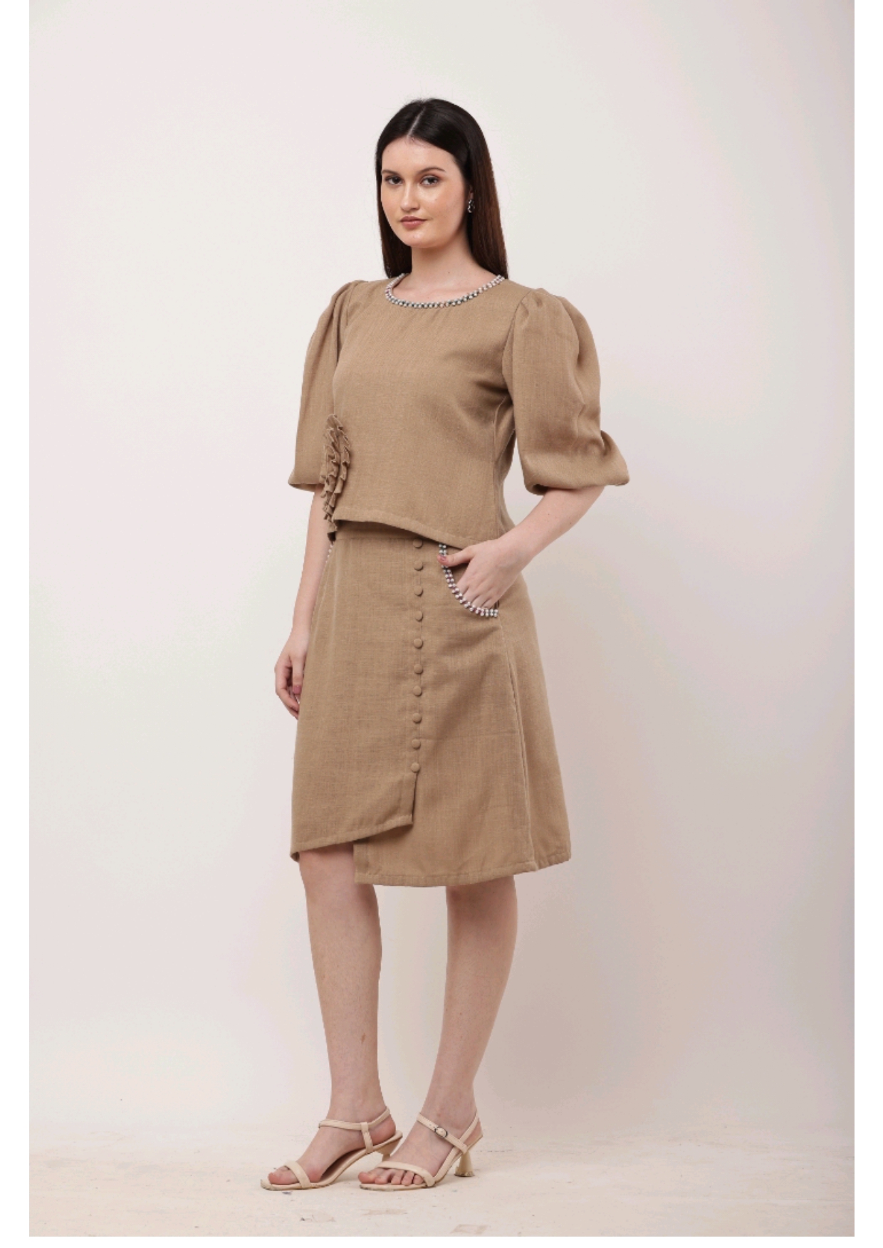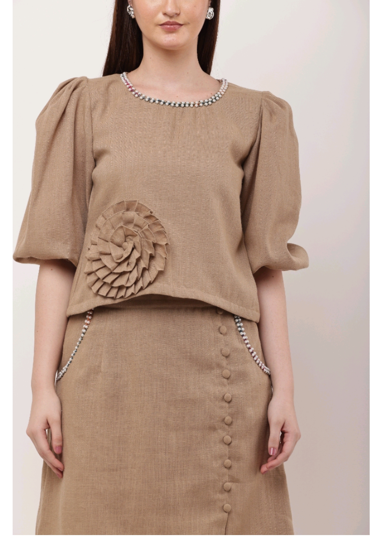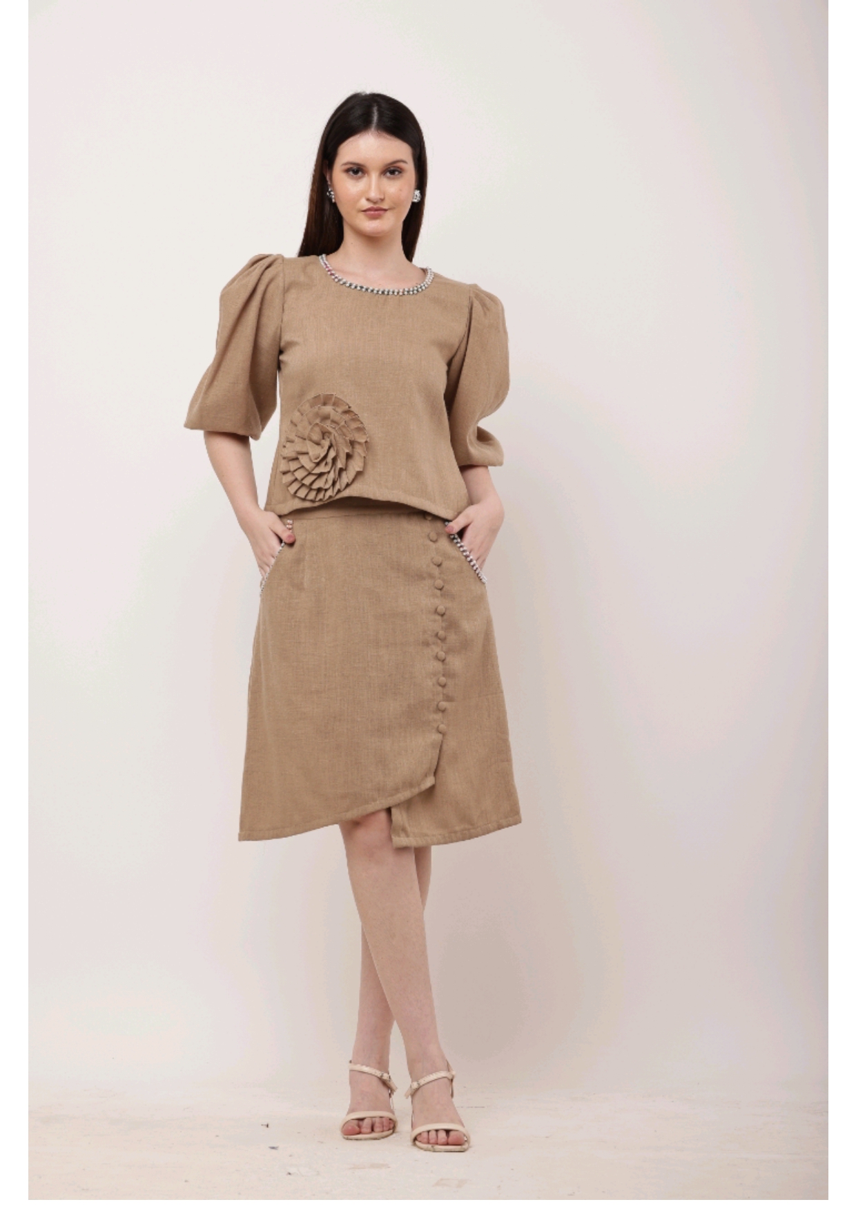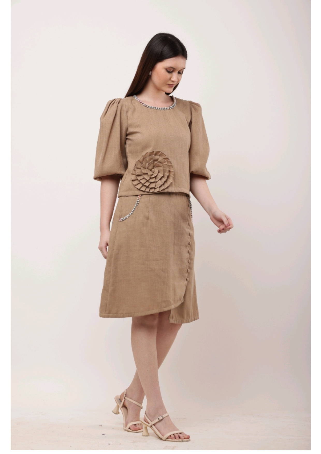 A blend of subtle charm and artistic detail – this camel-toned co-ord set with statement embroidery is perfect for chic, understated style.