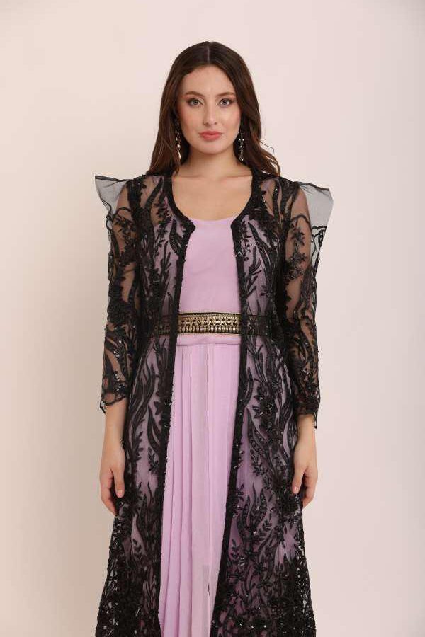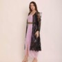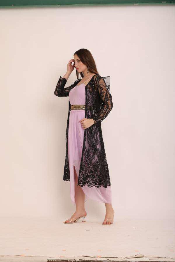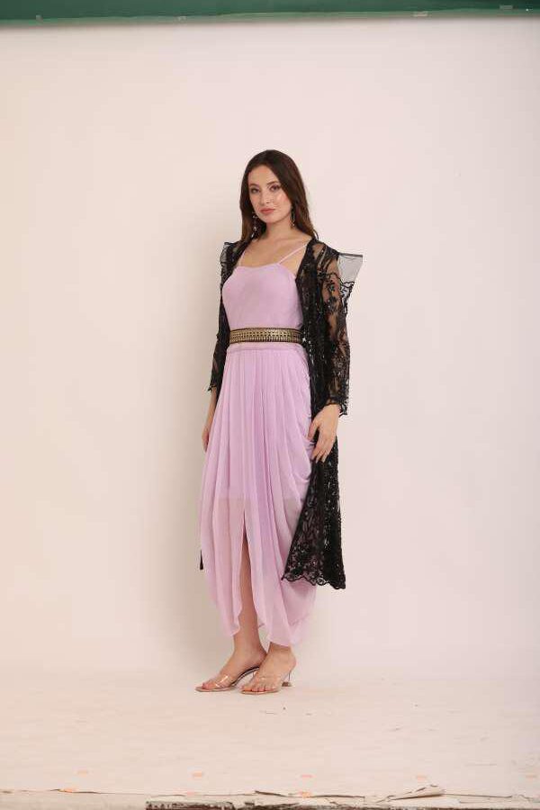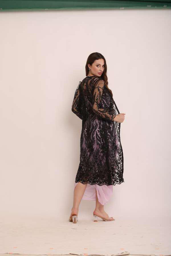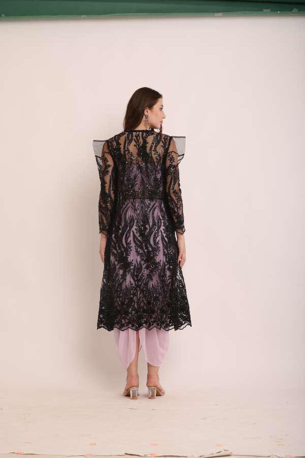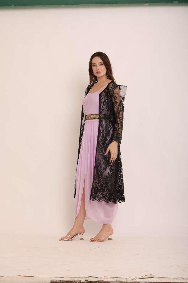 Turn heads with this dhoti jumpsuit with a full-length jacket, a stylish blend of traditional Indian attire and modern Western influences. Crafted with premium georgette and worked net fabric, this outfit is perfect for festive occasions, weddings, or formal events. Redefine elegance with comfort and stand out effortlessly!